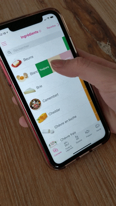 Pour chaque ingrédient, indiquez si vous l’avez « toujours », « parfois » ou « jamais » dans votre cuisine. Pour faire apparaître le bouton, il suffit de slider de la droite vers la gauche sur la case de l’ingrédient et de cliquer sur la case correspondante.